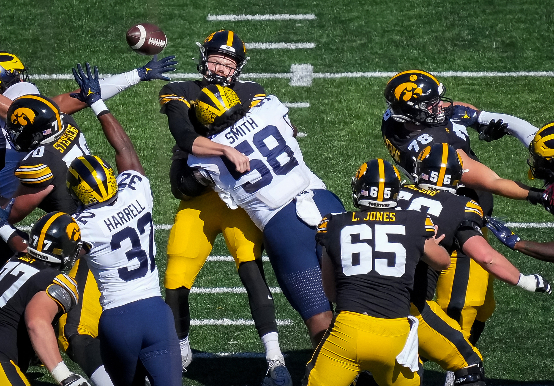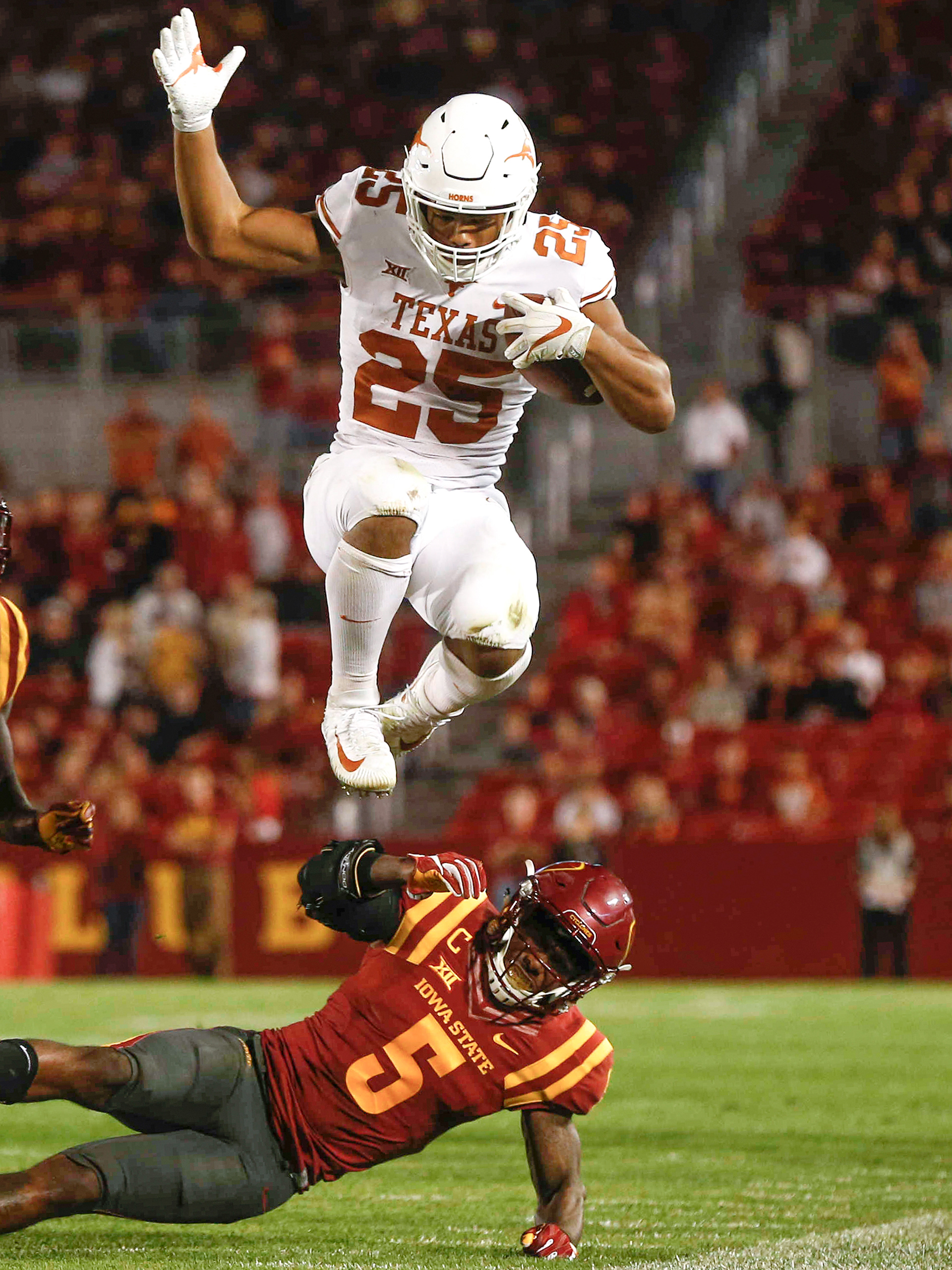 Iowa State junior running back Jirehl Brock fumbles the ball while jumping into the end zone against Iowa during the Cy-Hawk Series football game on Saturday, Sept. 10, 2022, at Kinnick Stadium in Iowa City.
