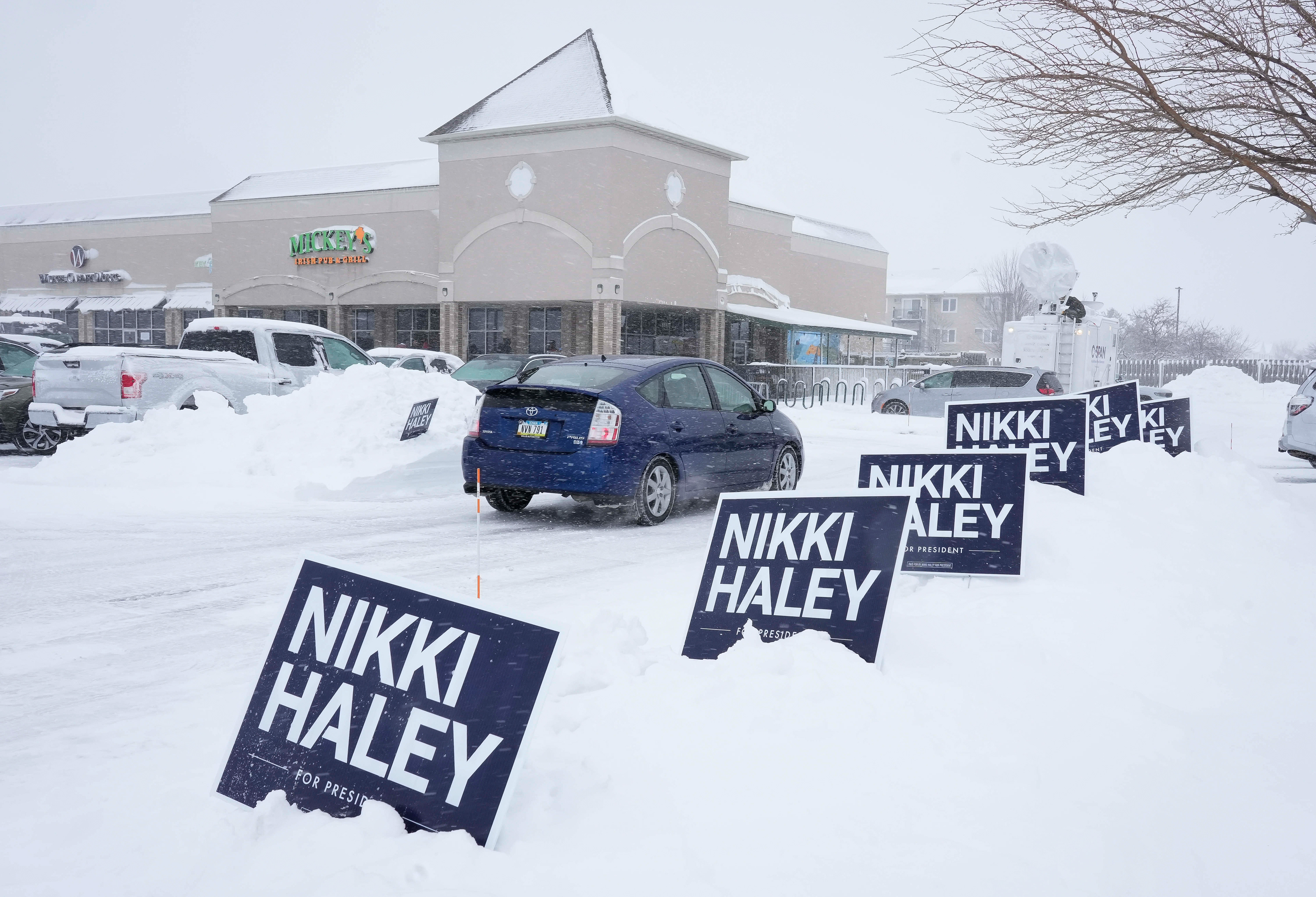 Jim and Sandy Pamperin, newlyweds from North St. Paul, Minn., drove to Iowa to hear Republican presidential candidate and former president Donald Trump speak during a rally Saturday, Nov. 18, 2023, in Fort Dodge, Iowa. (AP Photo/Bryon Houlgrave)