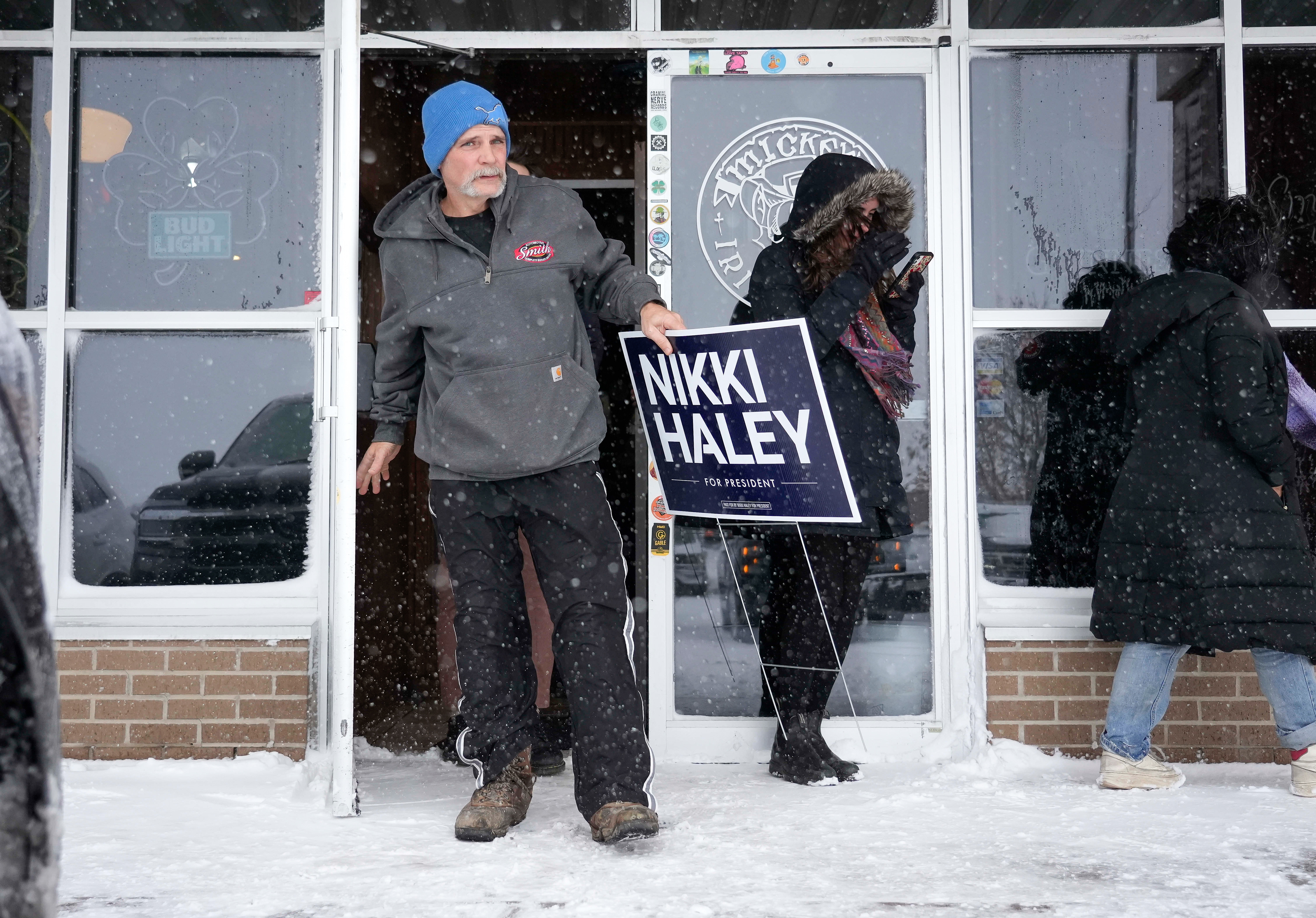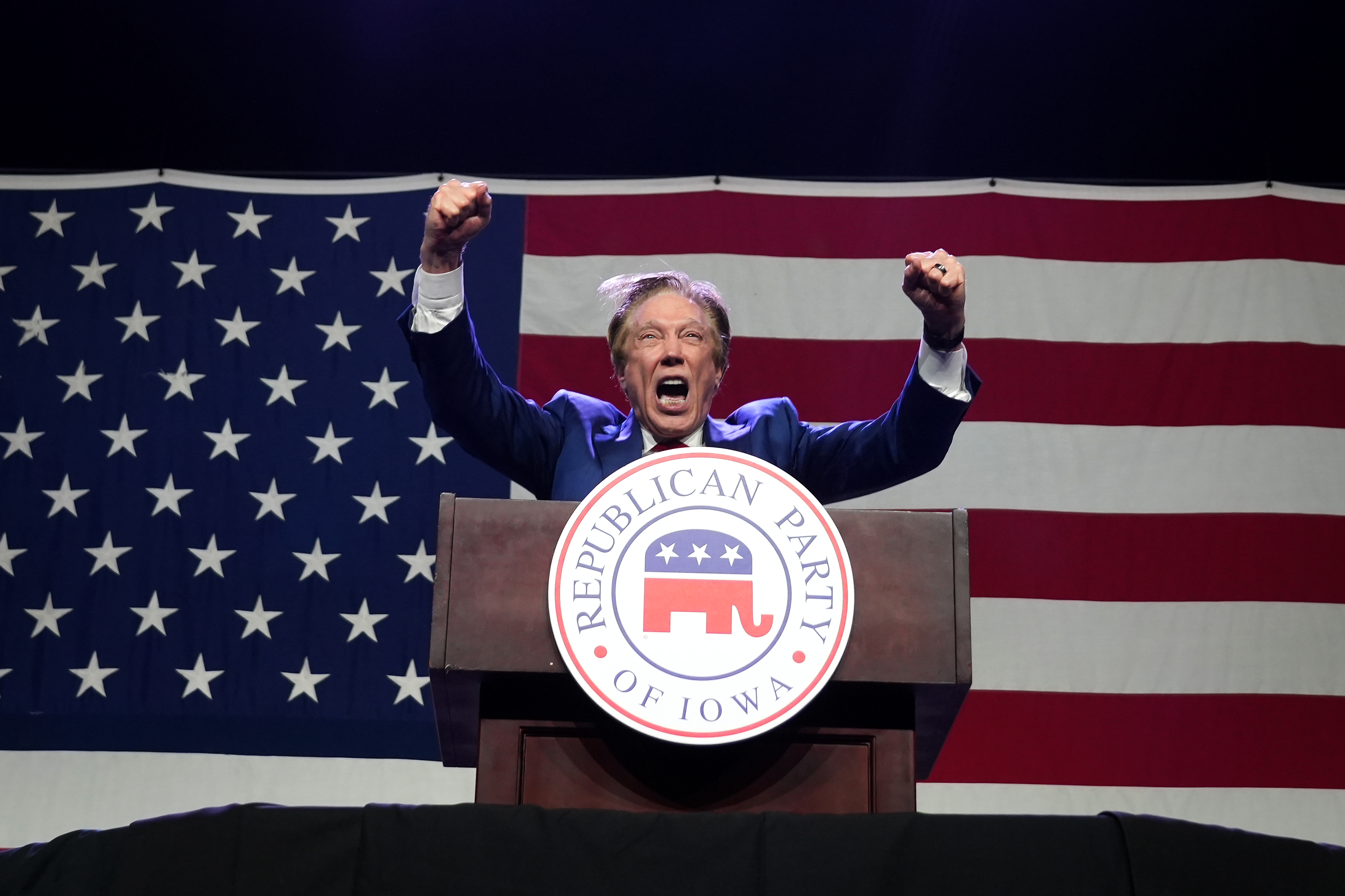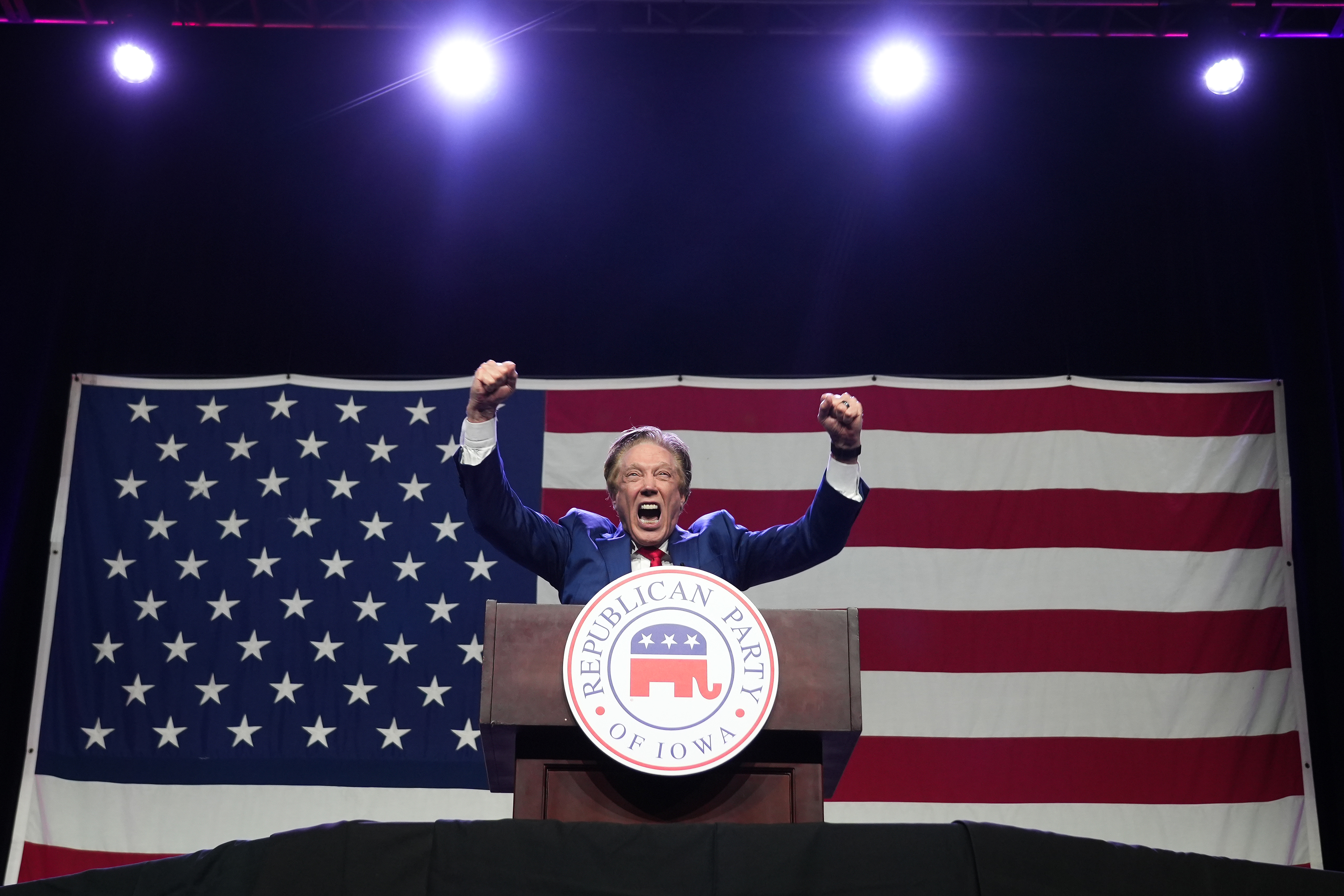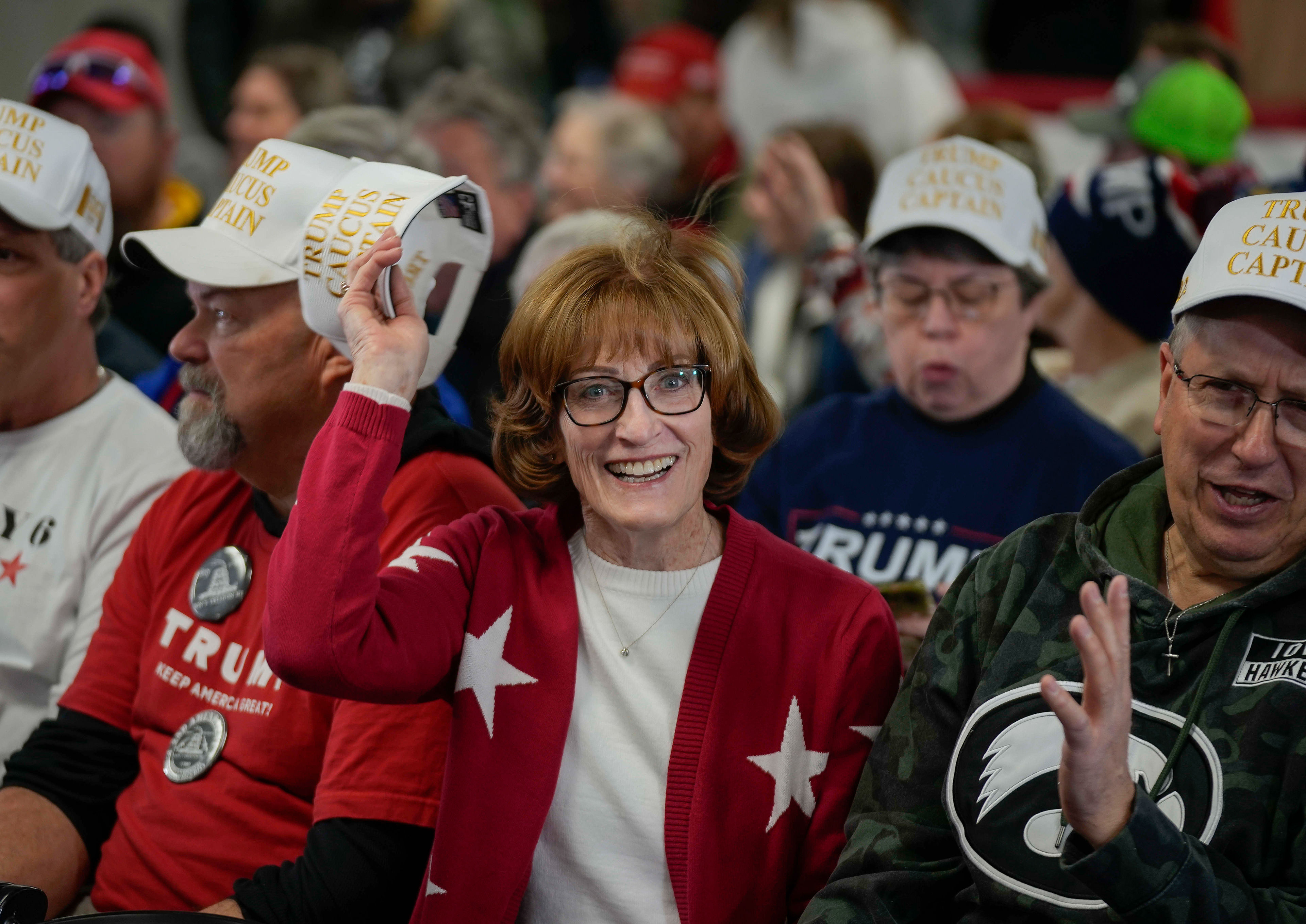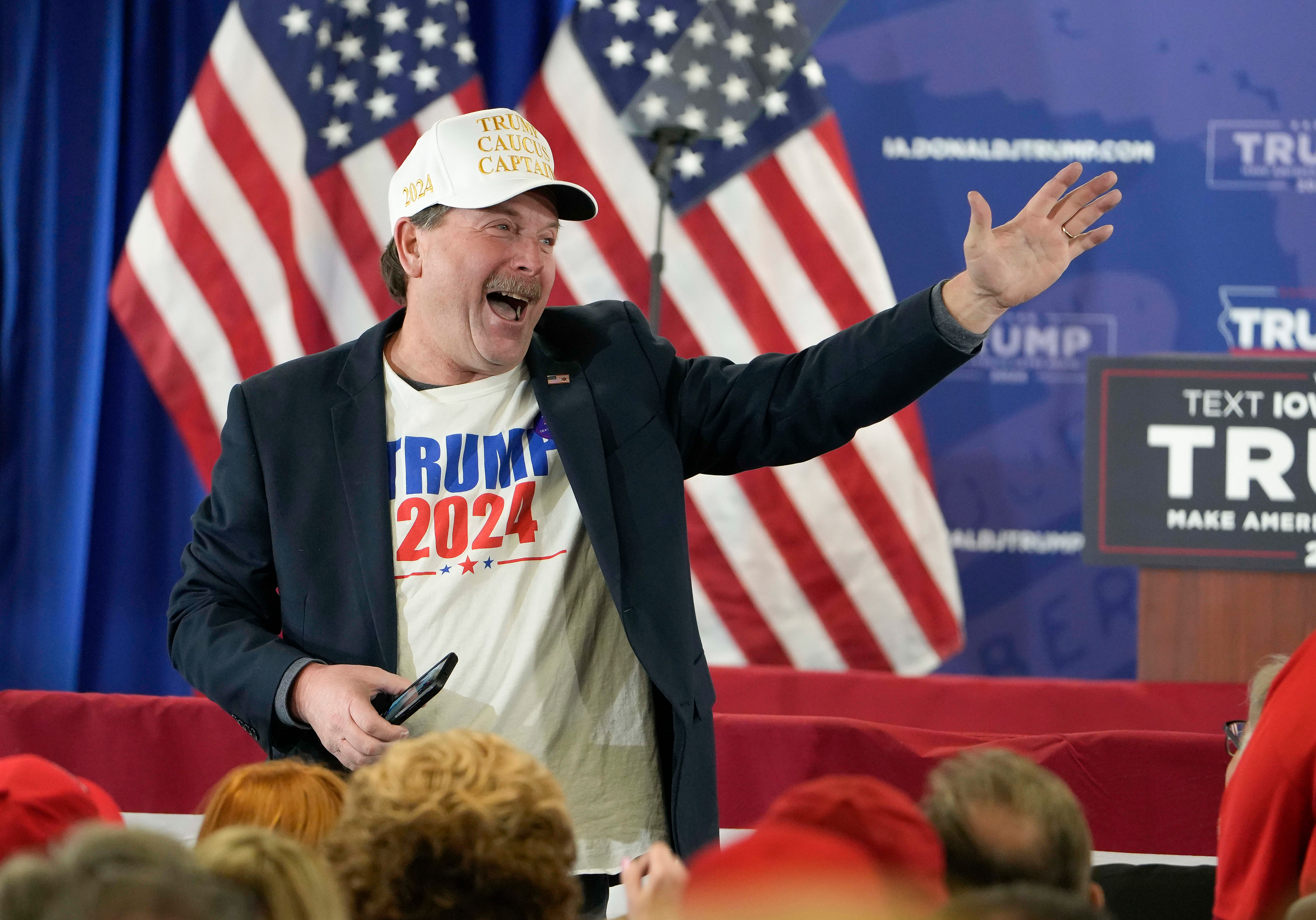 Gaylord Victora of Ames, Iowa, cheers before Republican presidential candidate and former president Donald Trump spoke during a rally Saturday, Nov. 18, 2023, in Fort Dodge, Iowa. (AP Photo/Bryon Houlgrave)