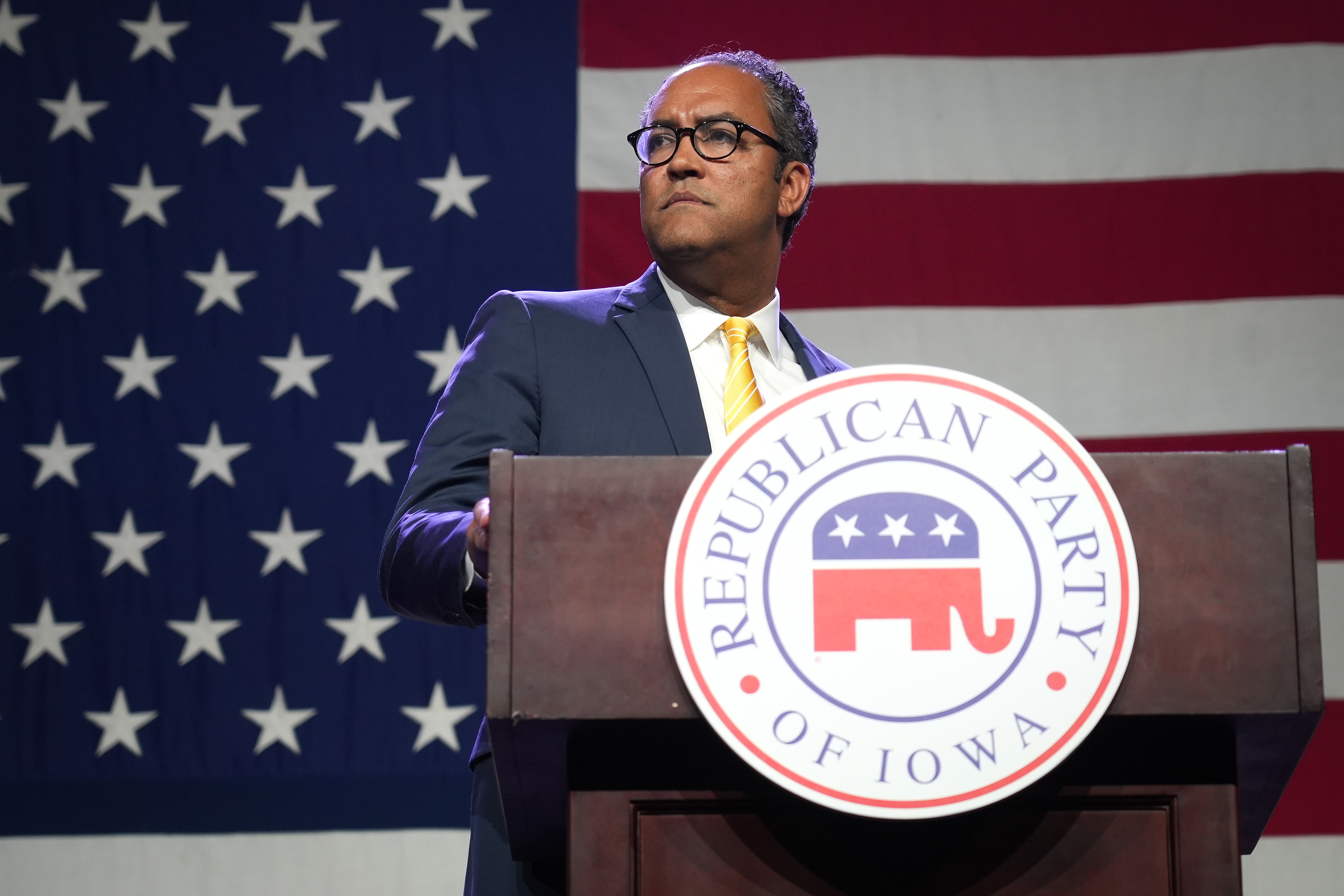 Republican presidential candidate businessman and pastor Ryan Binkley speaks with media prior to speaking at The Iowa Faith & Freedom Coalition’s fall banquet, Saturday, Sept. 16, 2023, in Des Moines, Iowa. (AP Photo/Bryon Houlgrave)