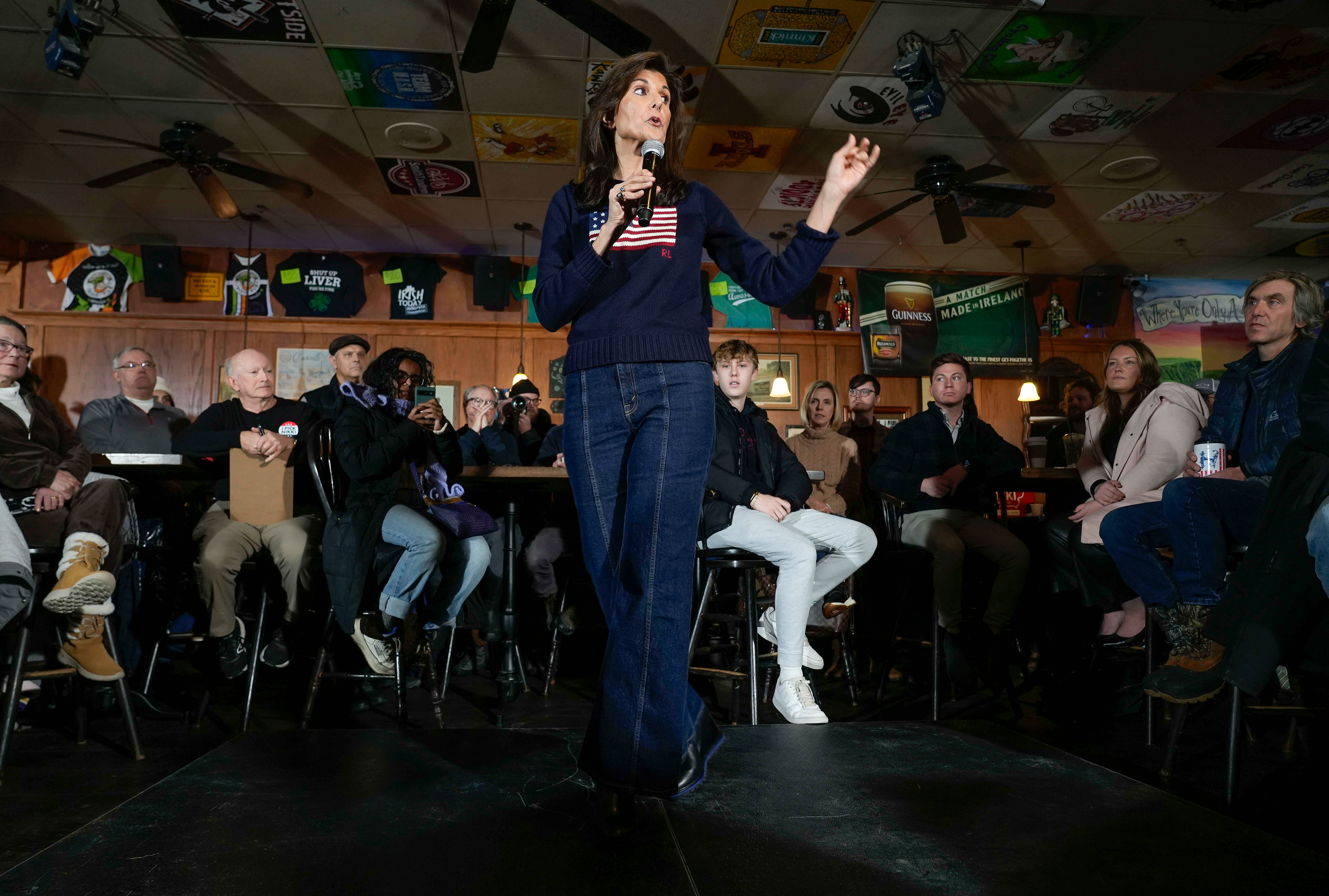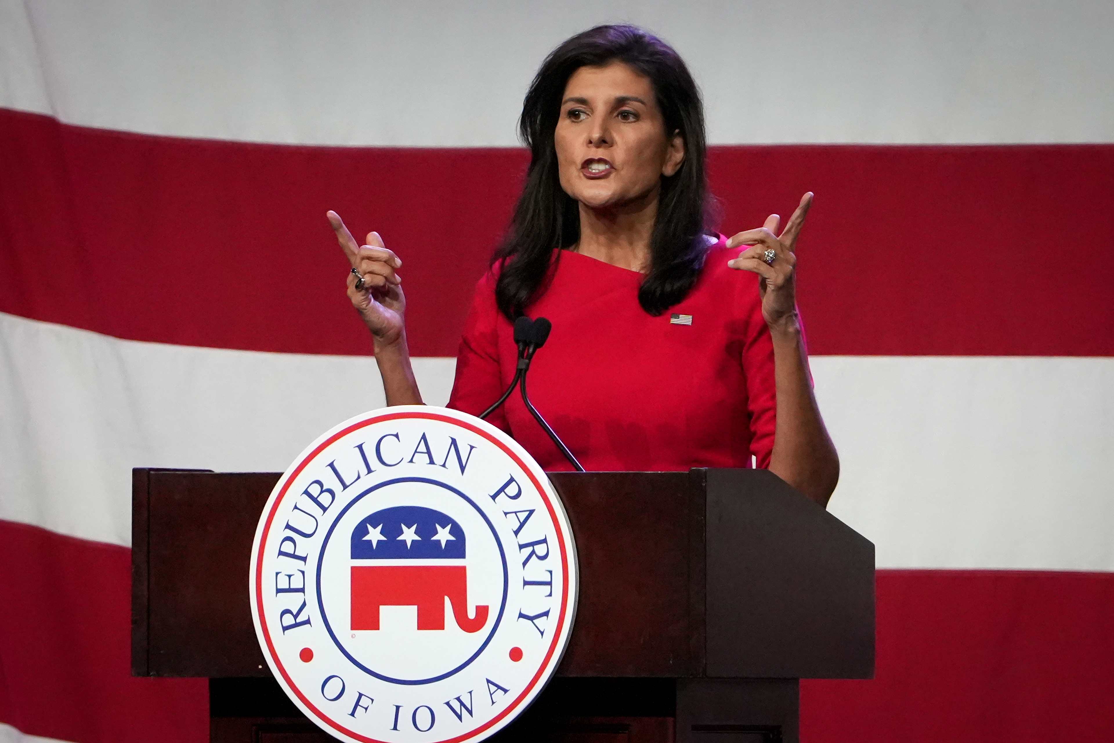 Republican presidential candidate former U.N. Ambassador Nikki Haley speaks at the Iowa Faith & Freedom Coalition’s fall banquet, Saturday, Sept. 16, 2023, in Des Moines, Iowa. (AP Photo/Bryon Houlgrave)