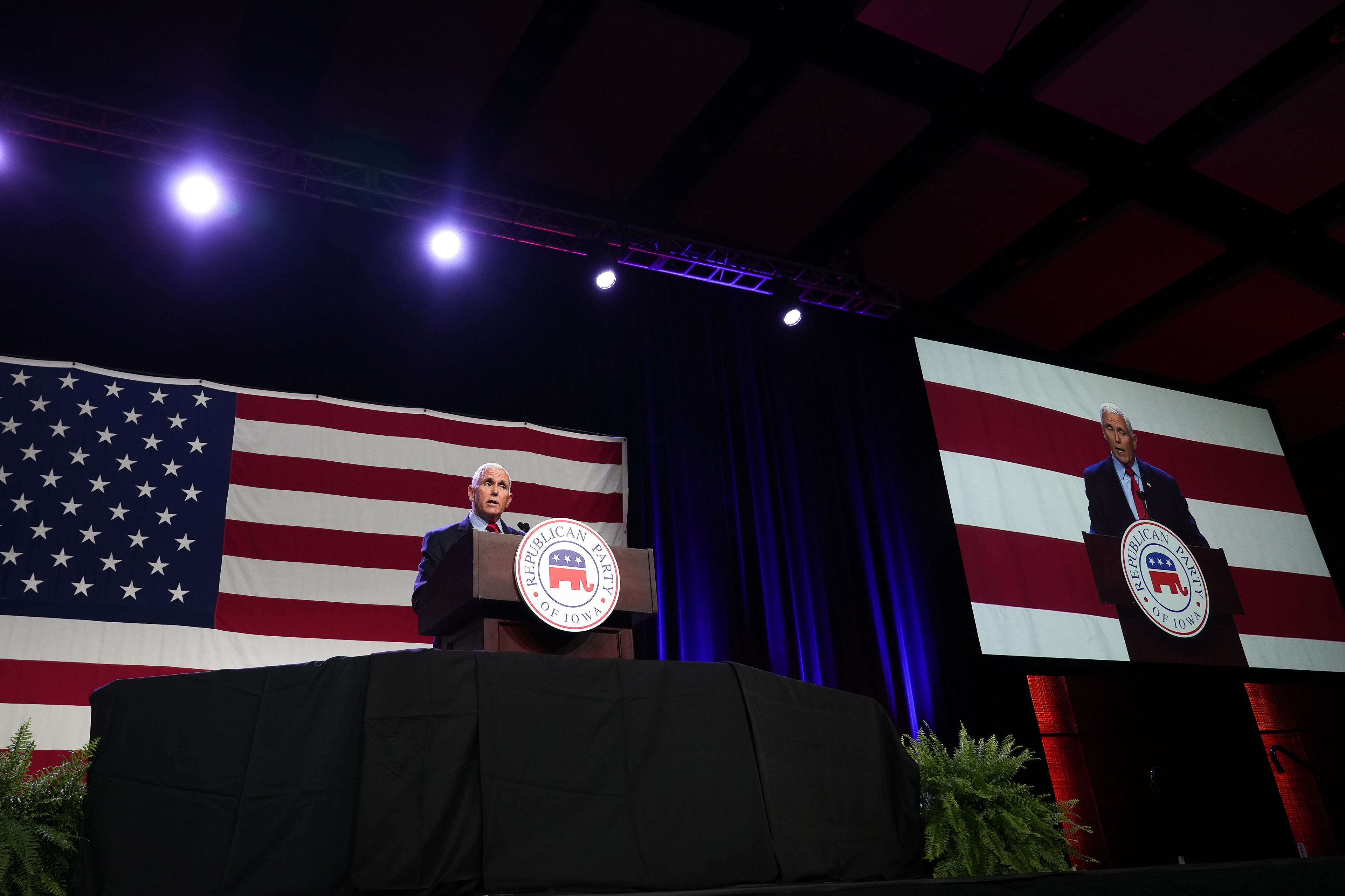 Republican presidential candidate former Vice President Mike Pence speaks at the Iowa Faith & Freedom Coalition’s fall banquet, Saturday, Sept. 16, 2023, in Des Moines, Iowa. (AP Photo/Bryon Houlgrave)