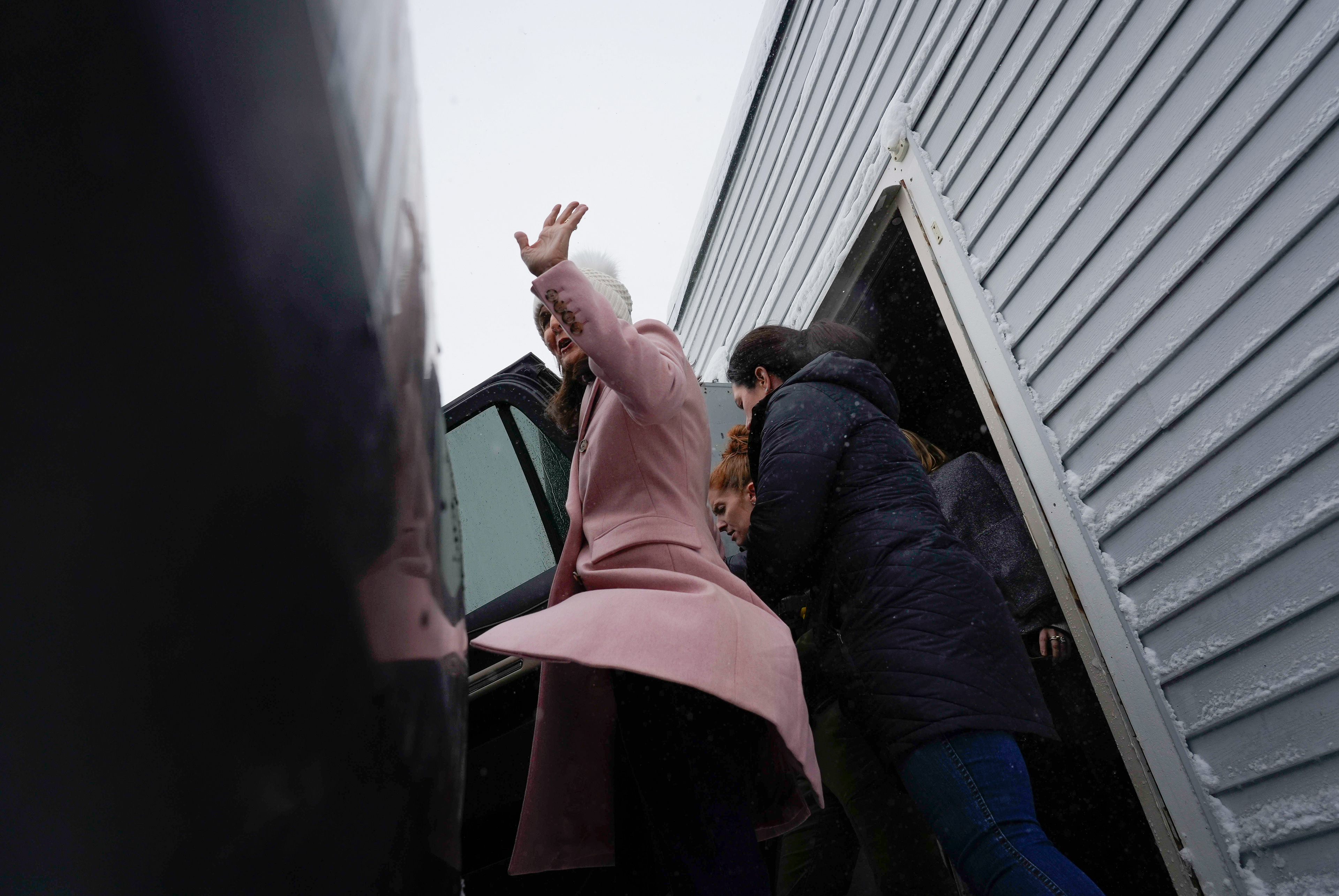 Joyce Bickford of Fort Dodge, Iowa, shows her pink hat while waiting to hear from Republican presidential candidate and former President Donald Trump during a rally Saturday, Nov. 18, 2023, in Fort Dodge, Iowa. (AP Photo/Bryon Houlgrave)