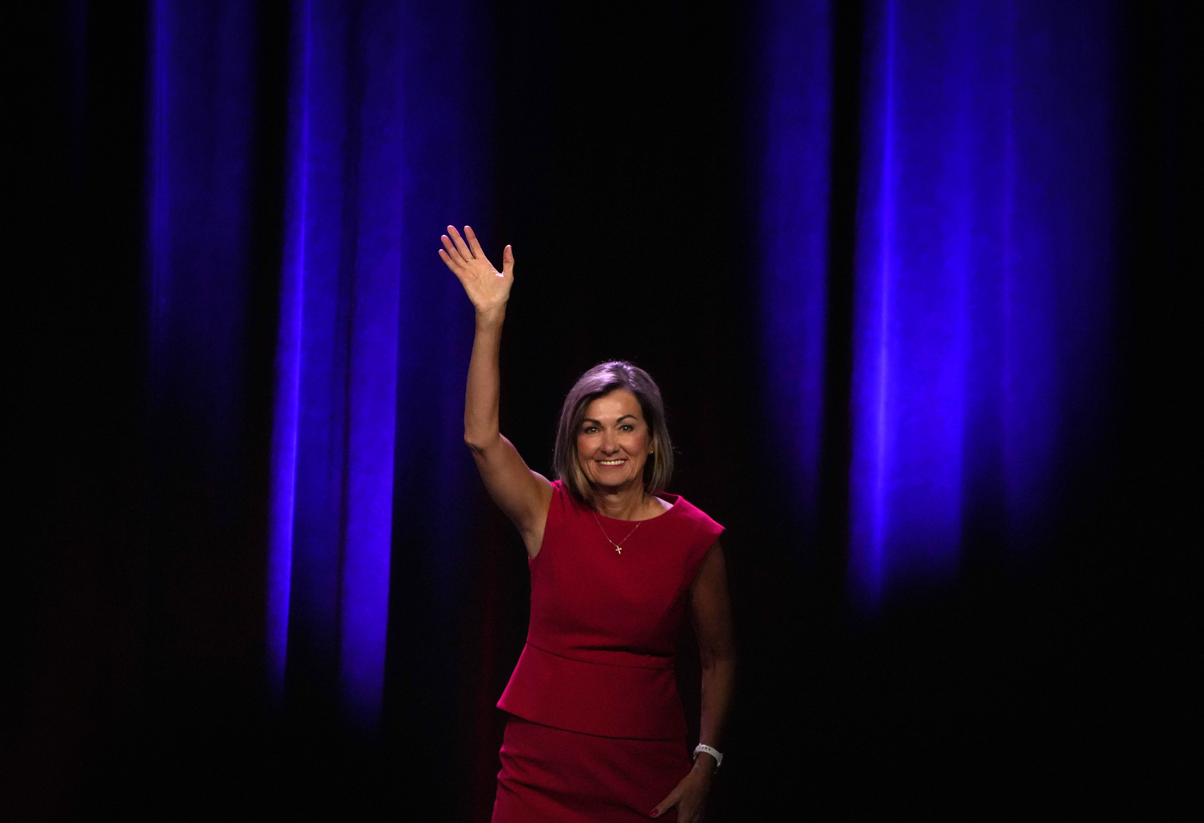 Iowa Gov. Kim Reynolds speaks at the Iowa Faith & Freedom Coalition’s fall banquet, Saturday, Sept. 16, 2023, in Des Moines, Iowa. (AP Photo/Bryon Houlgrave)