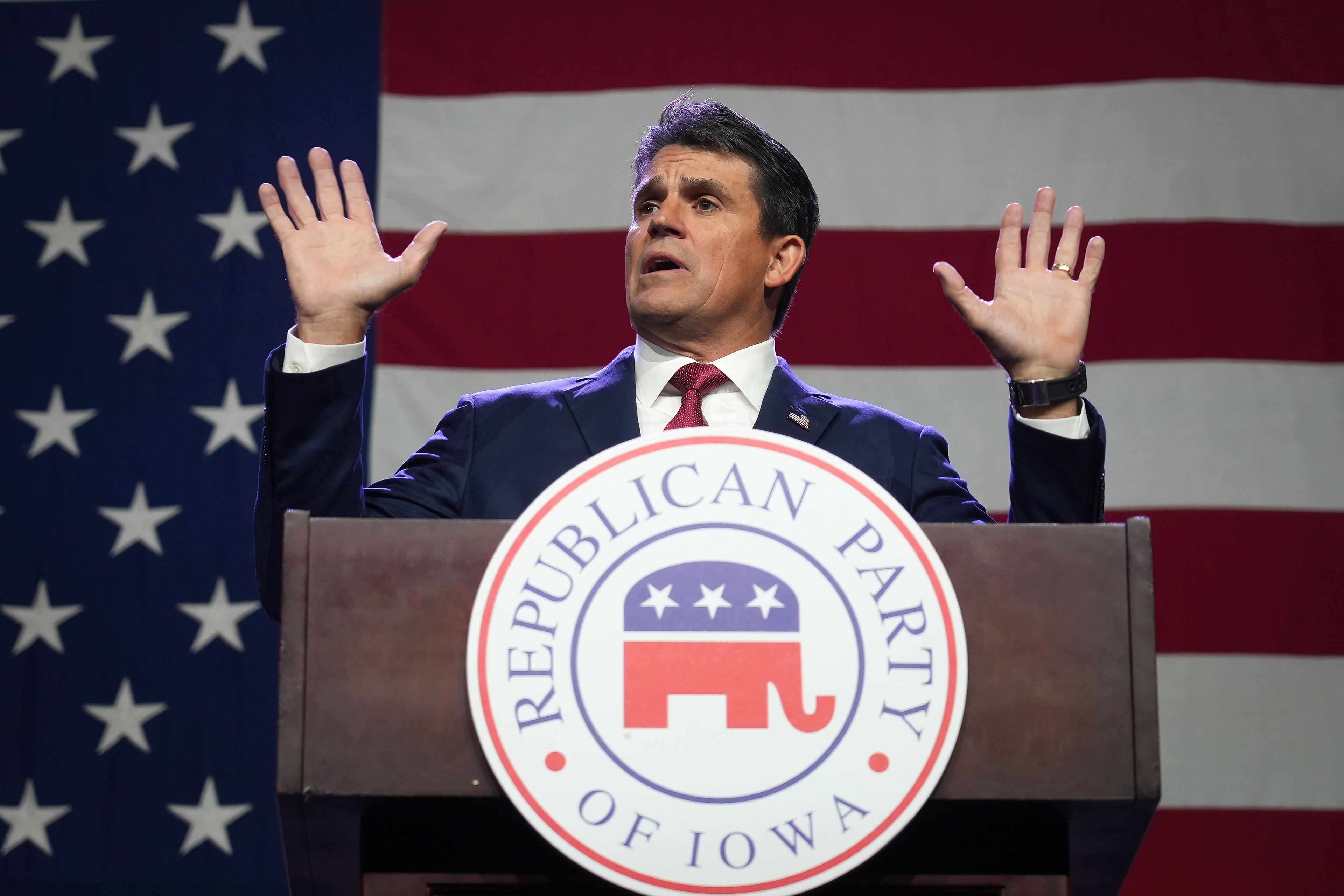 Iowa Gov. Kim Reynolds speaks during a rally with presidential candidate Florida Gov. Ron DeSantis, Monday, Nov. 6, 2023, in Des Moines, Iowa.